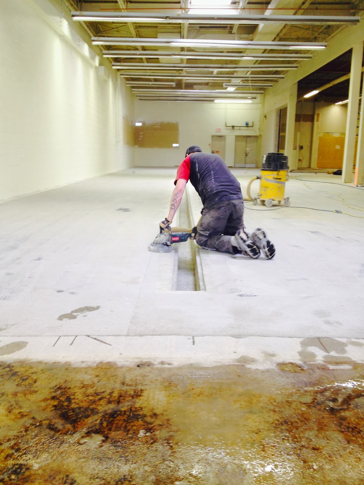 Here we see the floors being cut with a giant saw to release excess pressure and to stop cracks from forming. He used the saw to cut a number of incisions in the concrete from one end of the slab to the other. These small cuts will be filled with the epoxy later.